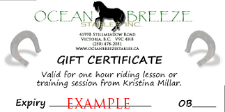 Ocean Breeze Stables Inc. is a horse training, riding & boarding facility located in scenic Metchosin, British Columbia, Canada. Metchosin is a rural suburb of Victoria, and is located approximately 30 minutes from Victoria and 20 minutes from Sooke. We strive on being a fun and relaxed stable, helping children and adults enjoy and further the bond between rider and horse. We currently offer horse boarding opportunities, training, sale and purchase consultation and horseback riding instruction. Ocean Breeze Stables is owned and operated by C.H.A. Master Instructor Kristina Millar. She is a highly experienced full time trainer, riding instructor and coach. Specializing in Natural Horsemanship theory and practice, Kristina has over 25 years of training and riding experience and deals with everything from colt starting to problem horses to trailering problems. Learn more about Kristina Millar.